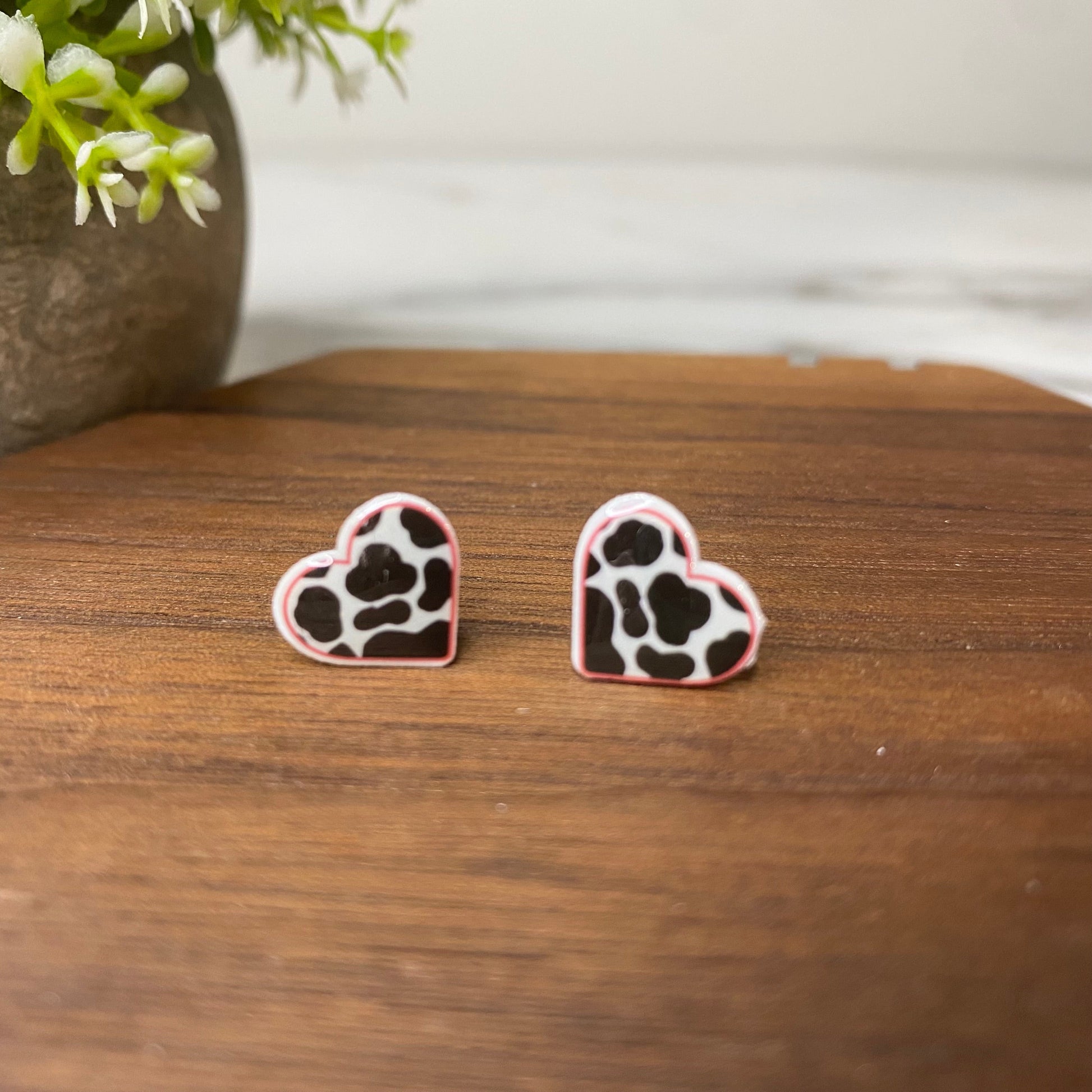 Acrylic Stud Earrings - Cow Print Heart
